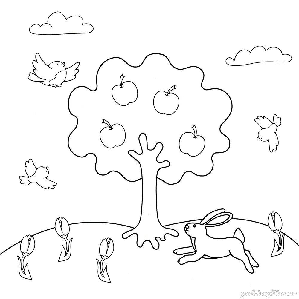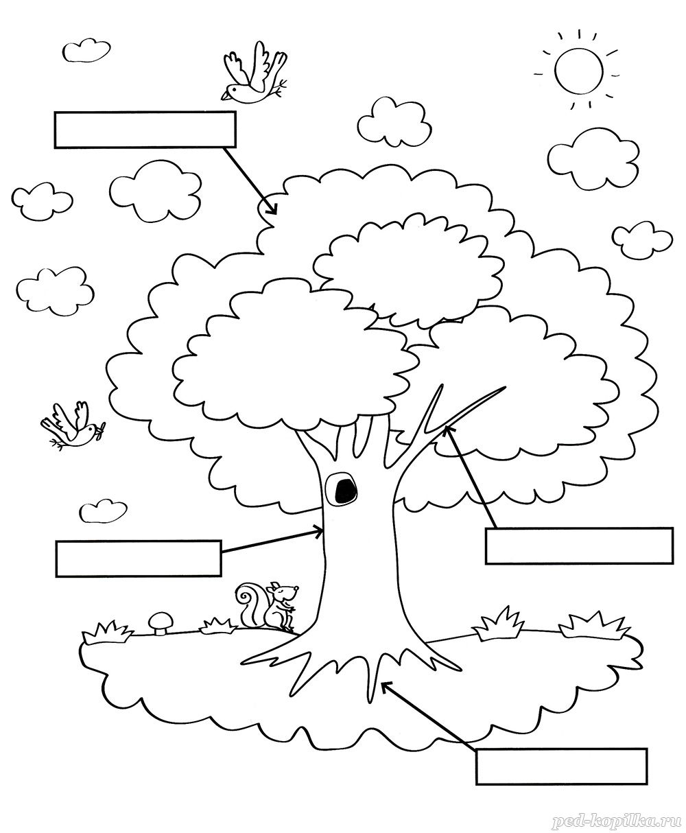 Подпиши все части дерева и раскрась картинку.