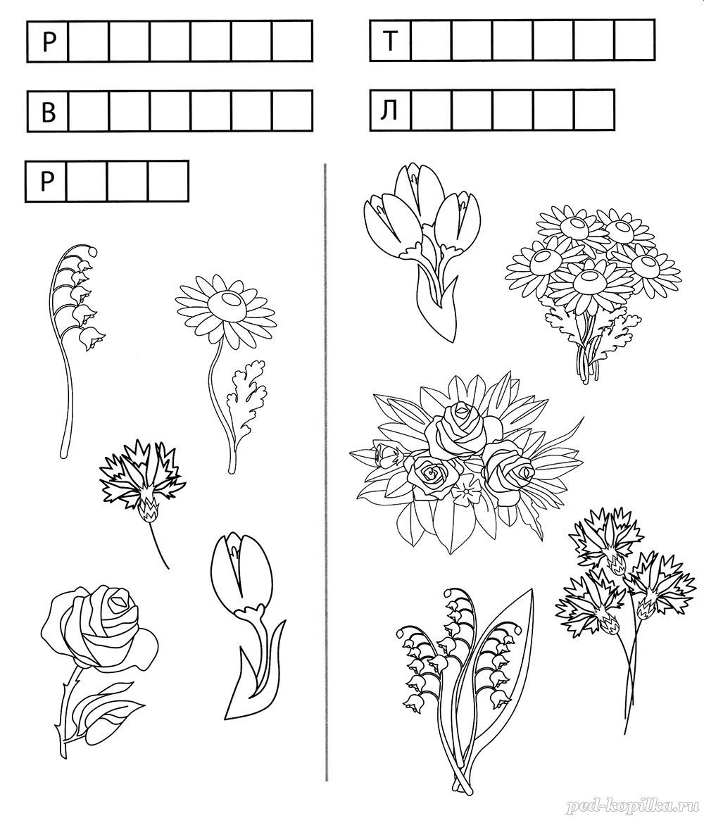 Впиши названия цветов в рамки. Соедини каждый цветок с букетом из таких же цветов.