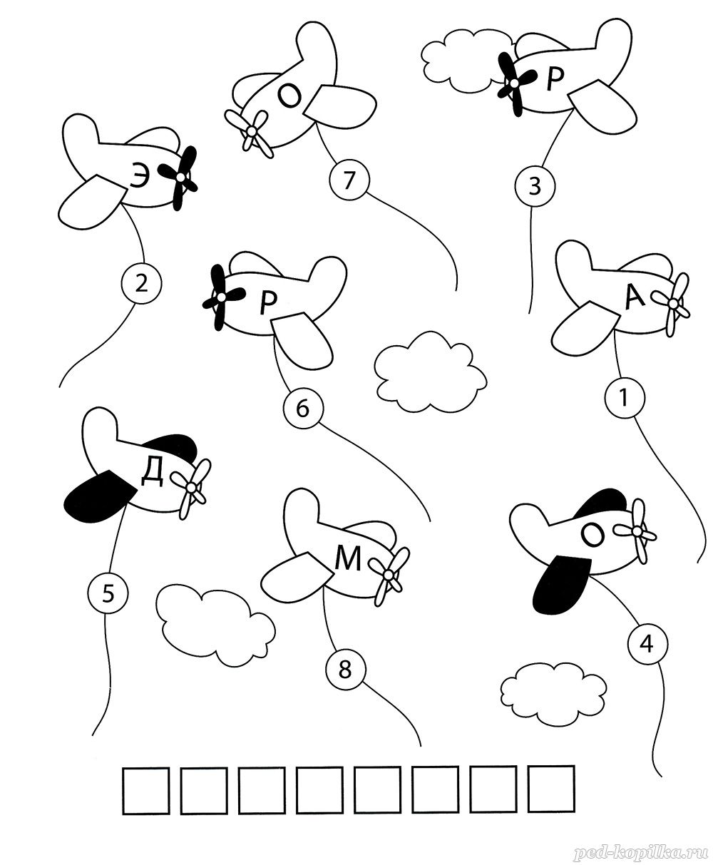 Составь из букв слово, используя подсказку из чисел на самолётиках. Запиши слово в клетки.