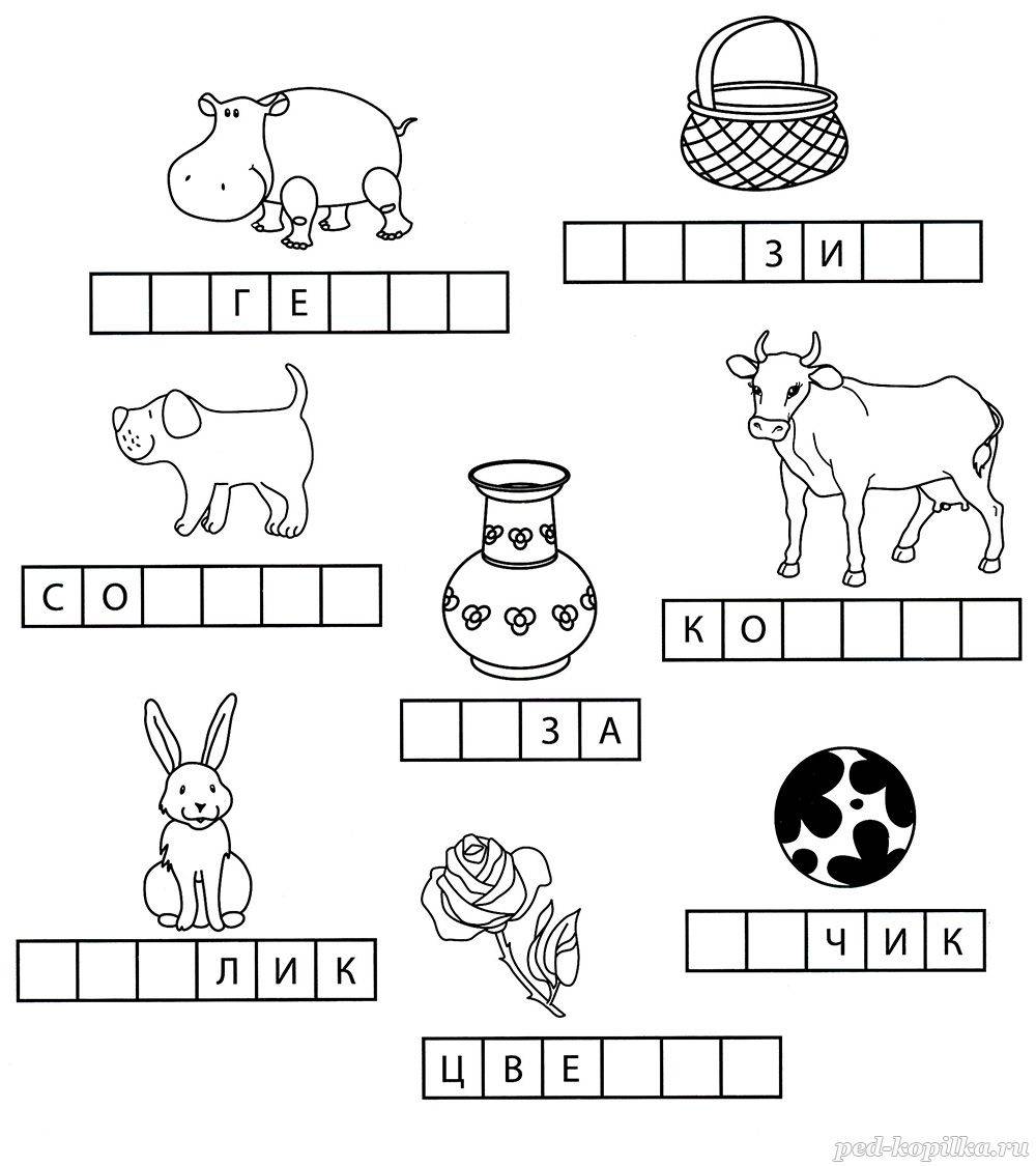 Что изображено на картинках? Произнеси эти названия по слогам. Допиши пропущенные буквы так, чтобы получились нужные слова.