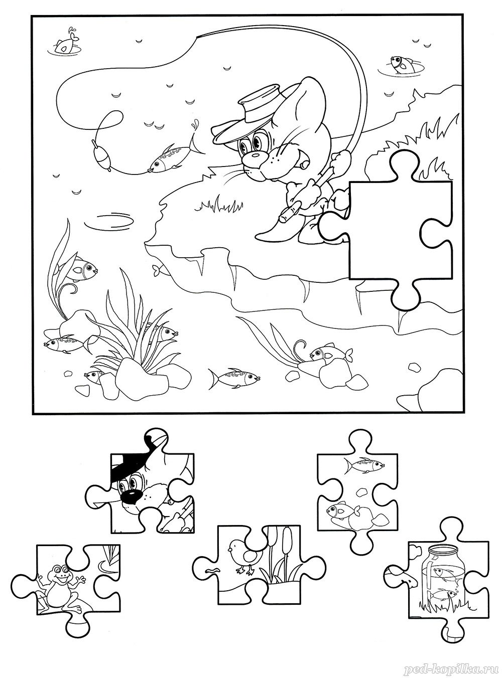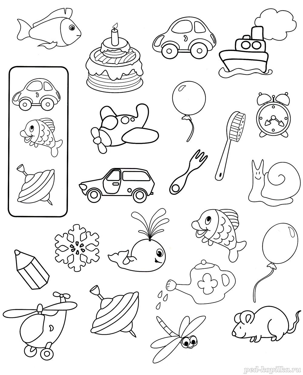 Найди на изображении все картинки из рамки и раскрась их.