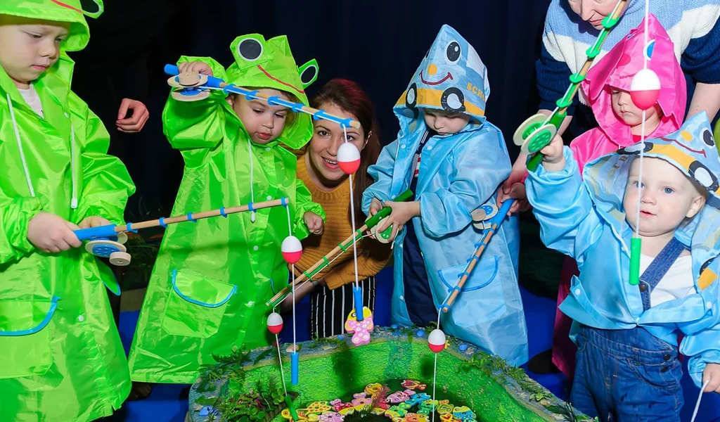 На этом сказочном представлении маленькие зрители отправятся на интерактивную рыбалку. И если наши зрители никогда не ловили рыбу, то самое время научиться этому сейчас. А чтобы не замочить наряды (ведь рыбалка у нас в самой настоящей мокрой воде), то устроим веселое переодевание в экипировку рыбака. Нет, нет! Не пугайтесь! Резиновые сапоги на представление брать не надо. Вас ждут замечательные непромокаемые плащики и ботиночки. Кроме рыбалки малышам предстоит торжественный спуск флотилии кораблей, знакомство с царицей озера – цаплей, и приключения вместе с непослушными лягушатами, убежавшими от мамы. А что из этого выйдет – узнаете на представлении.