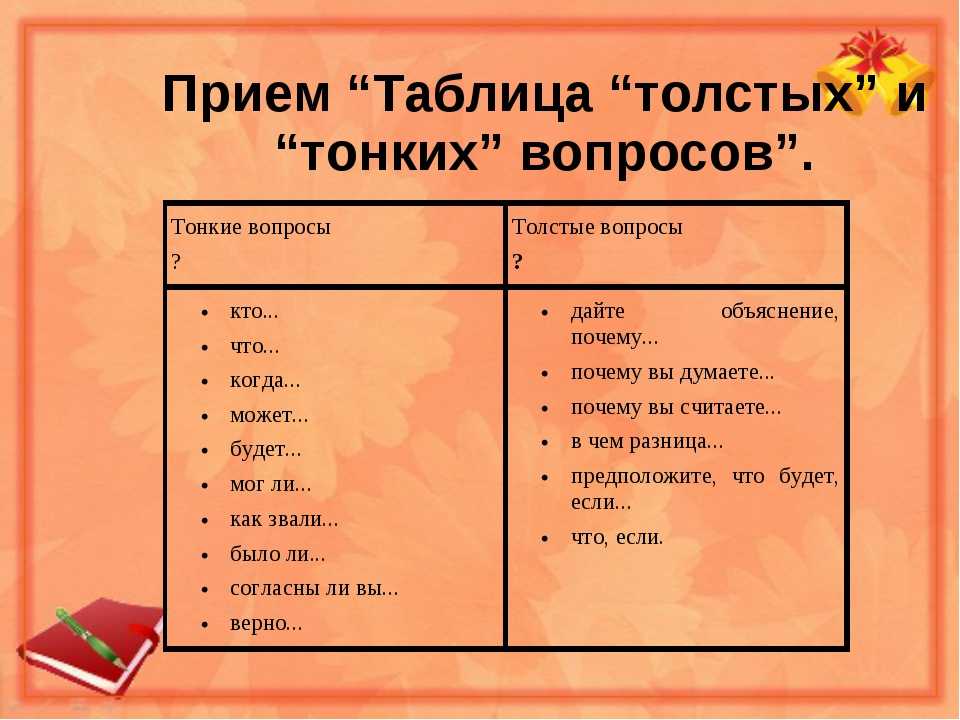 Толстые вопросы предполагают развернутые ответы, тонкие вопросы требуют односложные ответы или ответы, требующие знания фактов. на стадии осмысления – способ активной фиксации вопросов по ходу чтения, слушания; при размышлении – демонстрация пройденного.