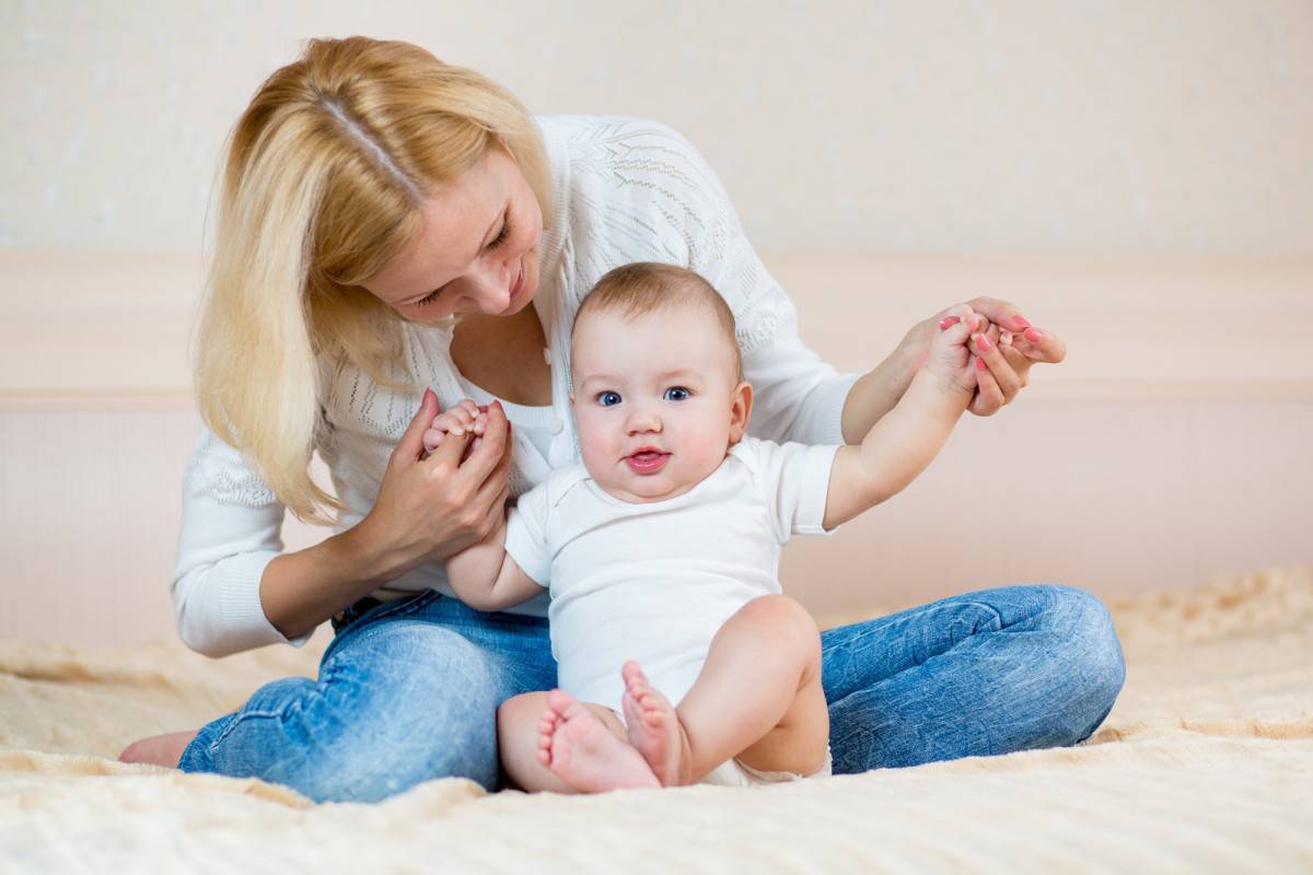 «Нахождение частей тела». Удивленно вопрошайте «а где наши ручки?», восклицайте «какая длинная шейка!», просите вытянуть ножки, а потом — поболтать ими. Вариантов масса.