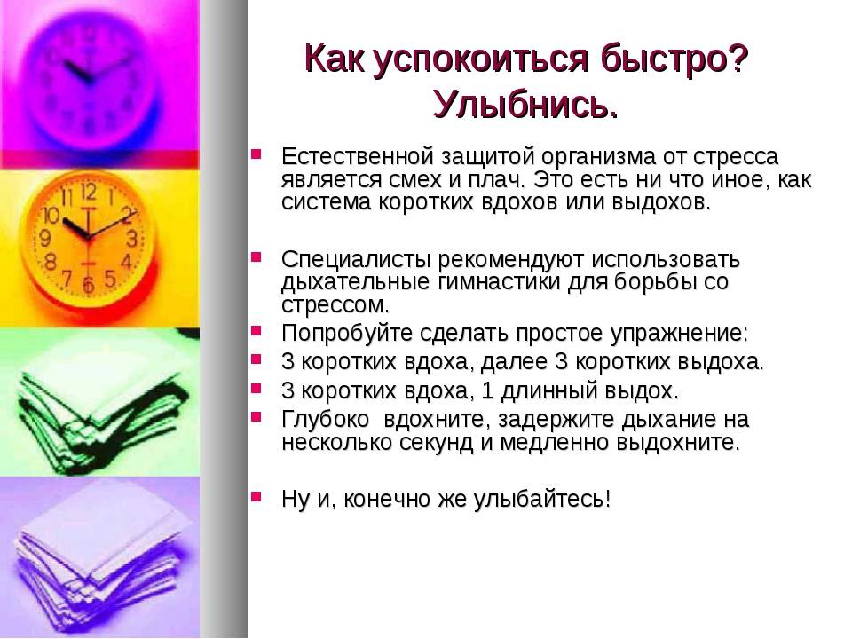 Спокойное размеренное дыхание снизит накал эмоций, позволит человеку прийти в себя, меньше переживать.