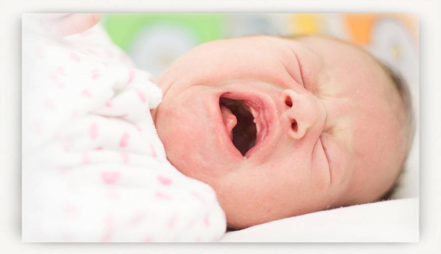 рот ребенка широко открыт, нижняя губа вывернута наружу