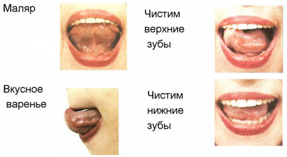 Следующая тренровка ассоциируется с чисткой зубов, для этого губы растягиваются в улыбке, а кончик язычка имитирует чистку задней поверхности зубов