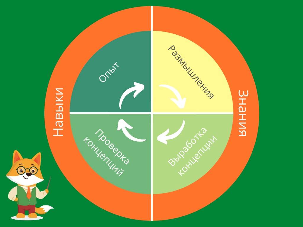 Процесс получения знаний и навыков на их основе в идеале должен состоять из нескольких этапов. Сначала ознакомление с каким-либо объектом или явлением, затем желание разобраться, как это работает, применение этого на практике и, наконец, осмысление пережитого опыта. Этот круг называется колесом обучения.