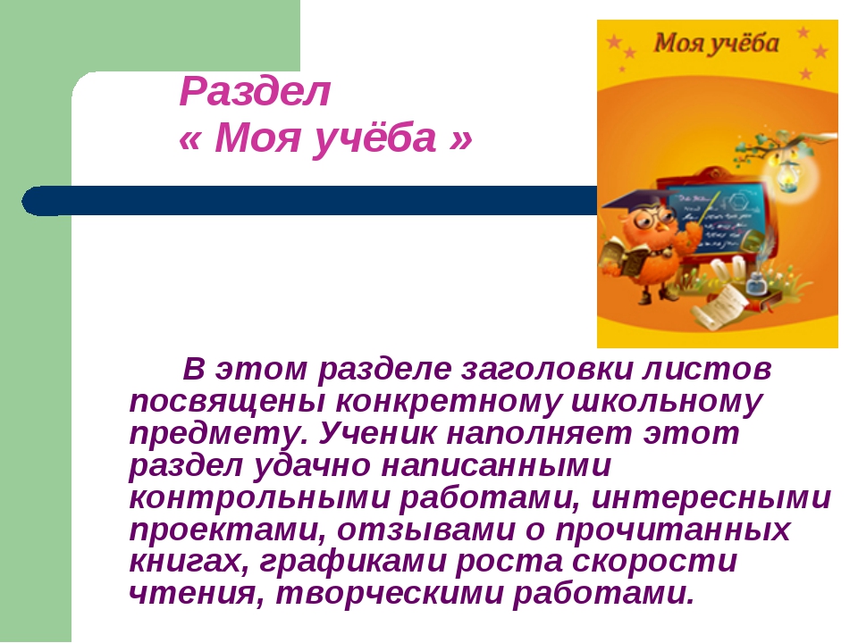 – сюда будут вкладываться работы, которые ребенок посчитает важными и ценными за целый год учебы. А оставшийся (менее ценный, по мнению ребенка) материал выкладываем, освобождая место для разделов для нового учебного года.