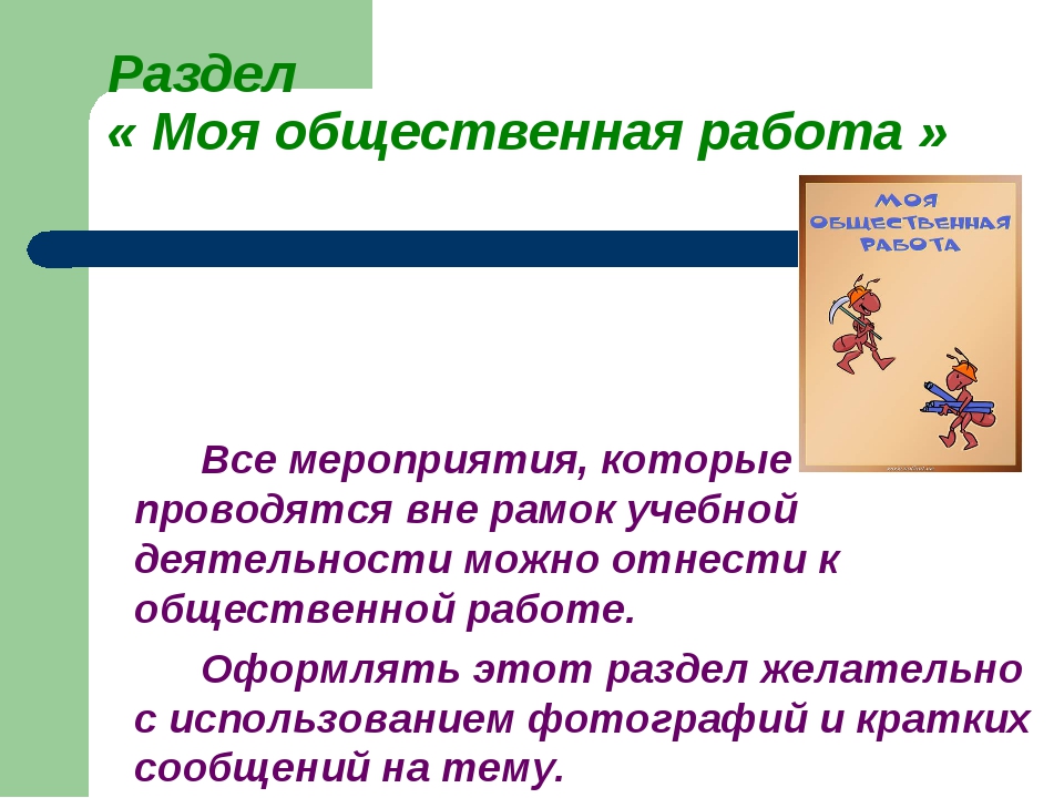 – даем краткое описание по каждому предмету, т.е. помогаем ребенку понять для чего он нужен. Так же можно написать свое отношение к предмету. Например, математика сложный предмет, но я стараюсь, т.к. хочу научиться хорошо считать или мне нравится музыка, потому что я учусь красиво петь.Моя общественная работа (общественная деятельность)