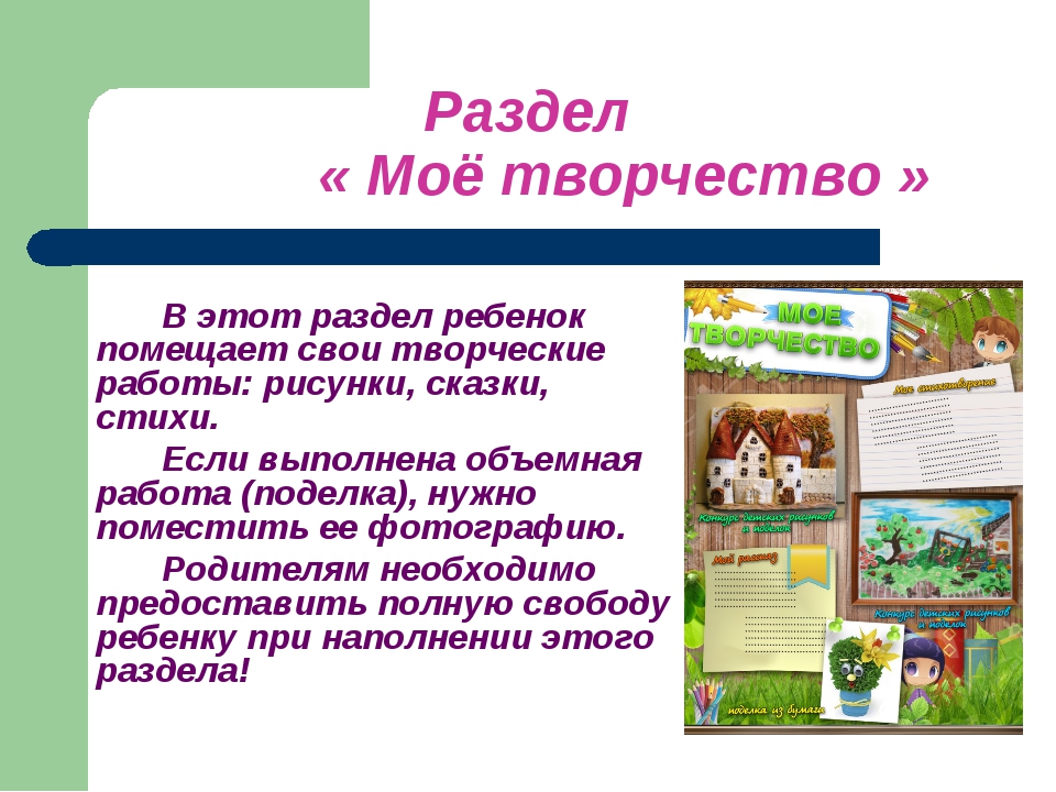 «Мое творчество» также может состоять из множества примеров творческих работ ученика. Лучше всего располагать их в хронологическом порядке, чтобы был виден прогресс творческих навыков ребенка.