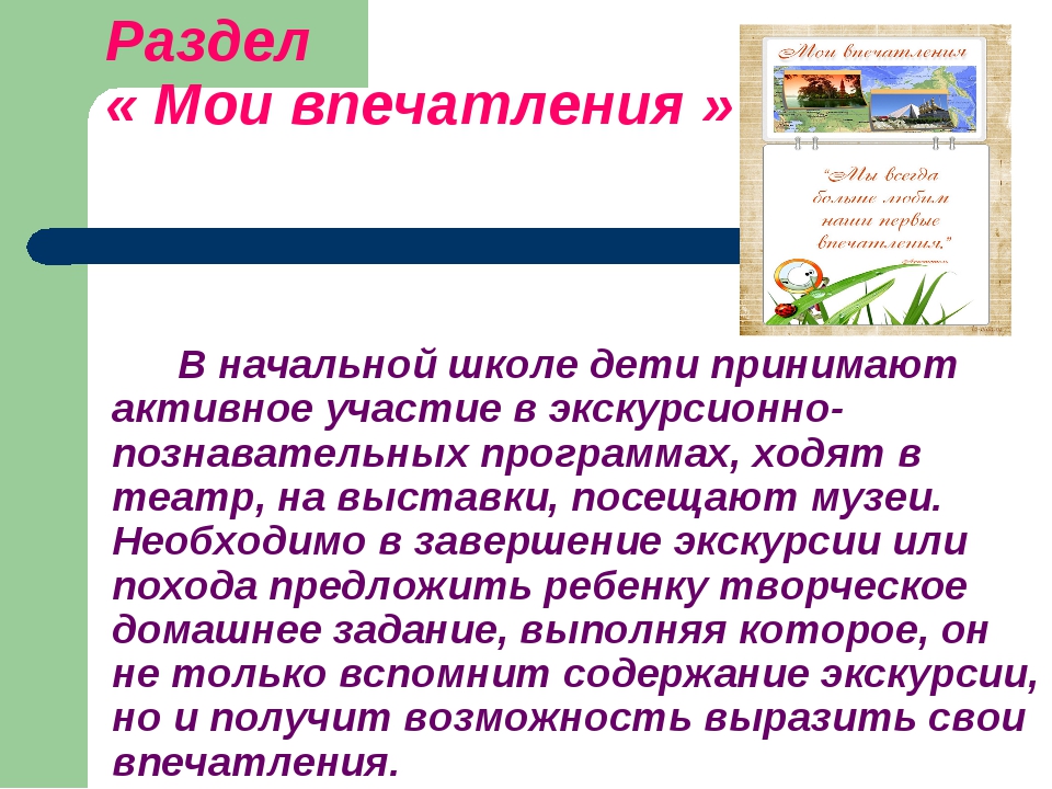 – данный раздел желательно заполнить с фотографиями, где ребенок принимал участие в школьной жизни (например, выступал на празднике, оформлял класс, стенгазету, читал стихи на утреннике и т.д.) + краткое описание о впечатлении/эмоциях от выполнения общественной деятельности.Мои впечатления (школьные мероприятия, экскурсионно-познавательные мероприятия)