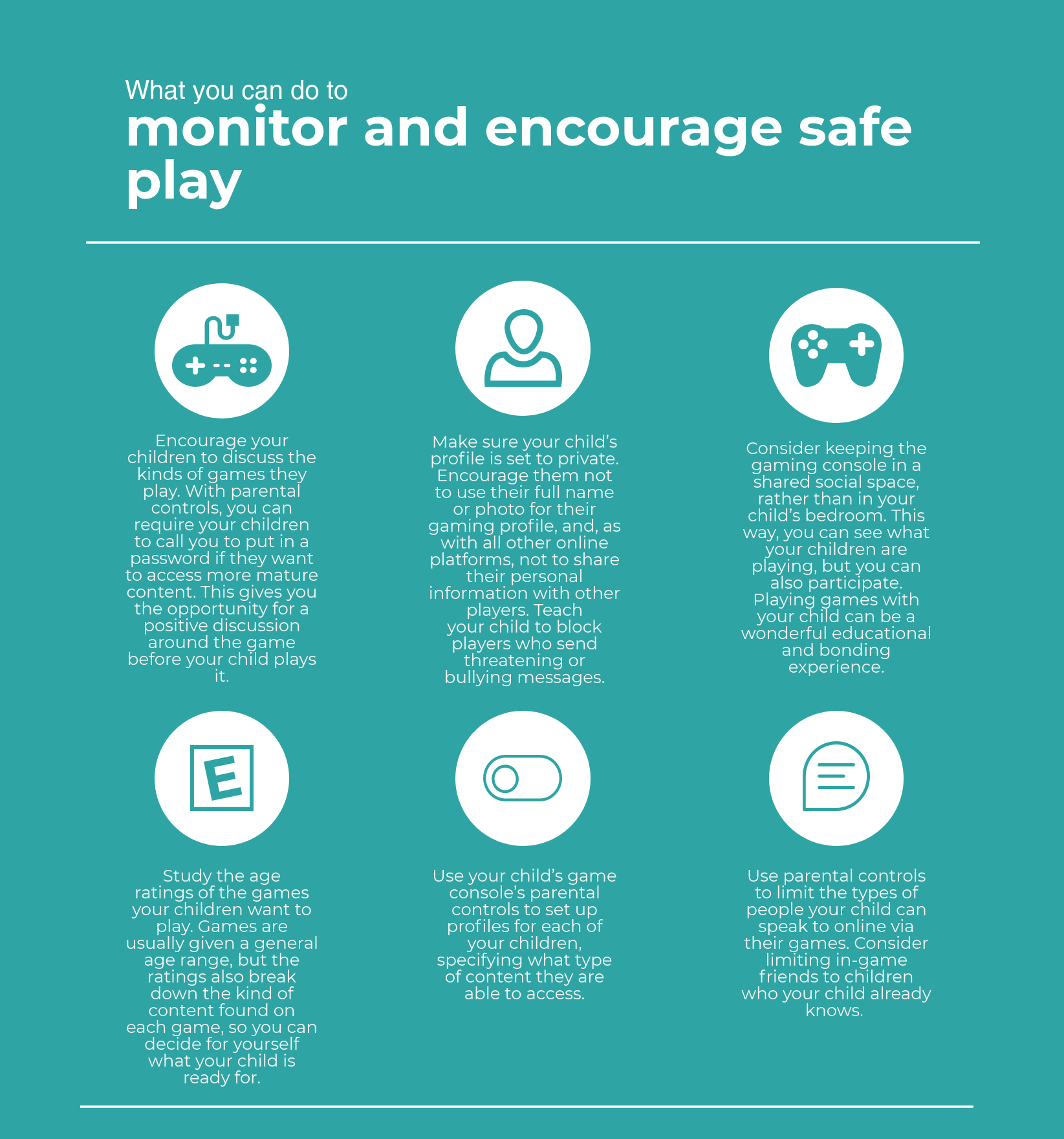 Обсуждайте с детьми игры, в которые они играют. Убедитесь, что профиль ребенка переведен в приватный режим. Подумайте над установкой приставки в месте, которым пользуются все члены семьи. Изучайте возрастные рейтинги игр. При создании профилей используйте родительский контроль. Объясните ребенку, что разговаривать онлайн можно далеко не со всеми.