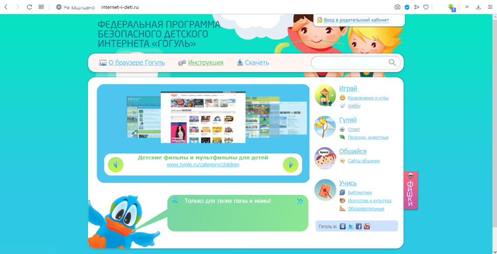 Чтобы оградить ребенка от опасного контента, можно установить так называемый «детский браузер» Гогуль с расширением Angry Duck. Ребенок не сможет запустить любой другой браузер или зайти на целый ряд нежелательных сайтов. Время пребывания в интернете также будет контролироваться.