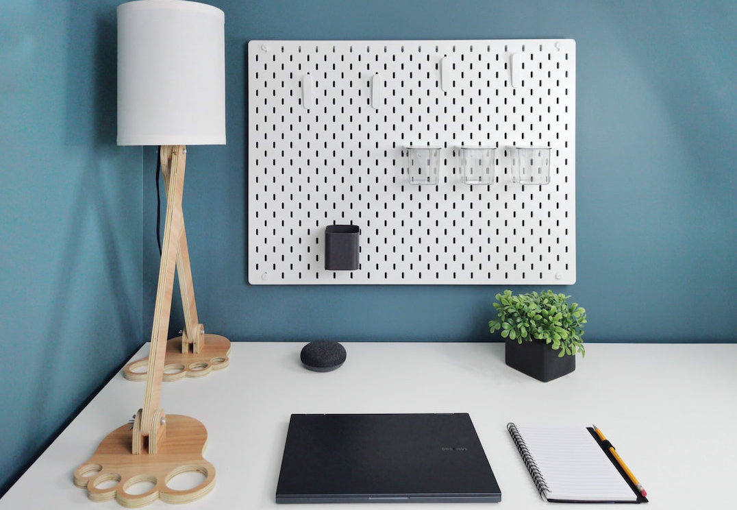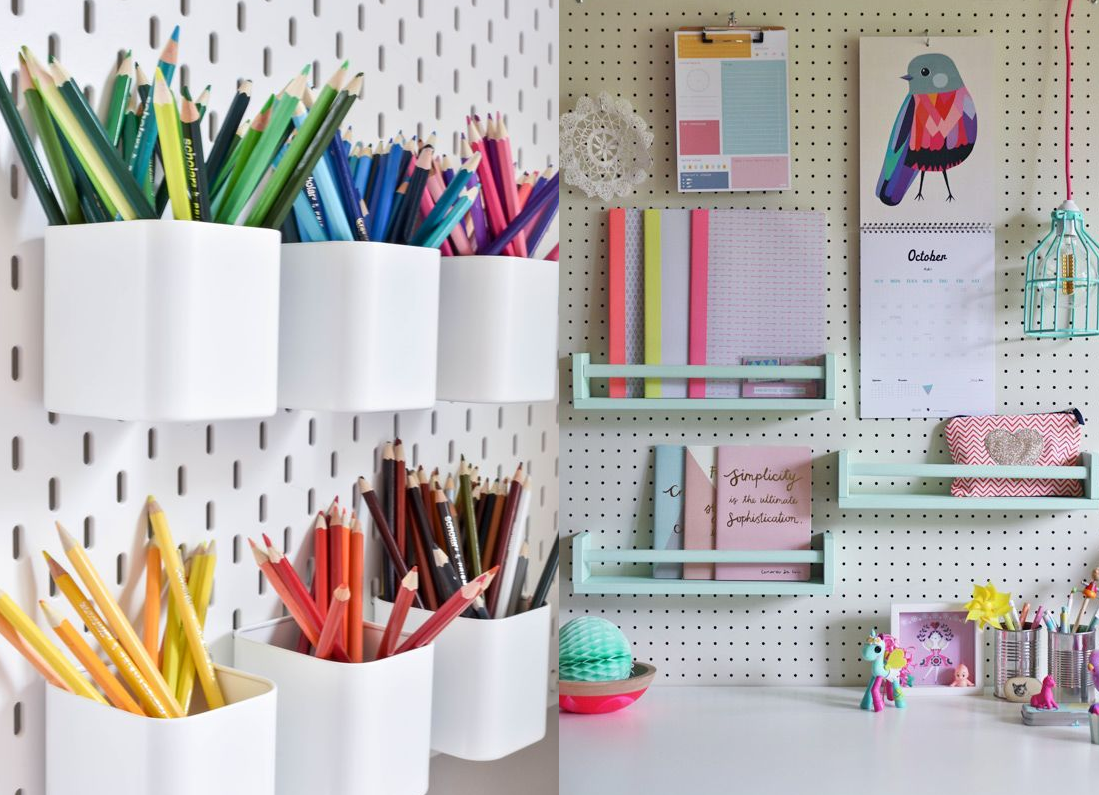 Пегборд — это специальная перфорированная доска, на которую можно крепить органайзеры, полки, лотки, календарь, рисунки и школьное расписание.