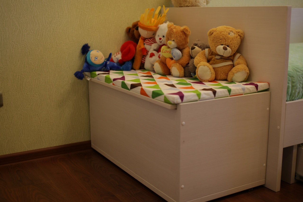 Особый интерес в вопросе, где хранить детские игрушки, представляют пуфы с откидными сидениями. В них можно спрятать и мягкие игрушки, и конструктор, и еще много полезных вещей.