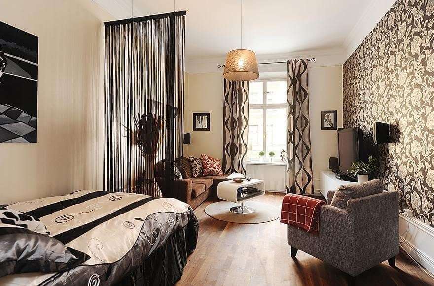 Две зоны, светло-кремовая и темно-коричневая, сделают из ваших шестнадцати метров изысканную комнату, в которой можно посидеть с гостями и отдохнуть на кровати после насыщенного дня.