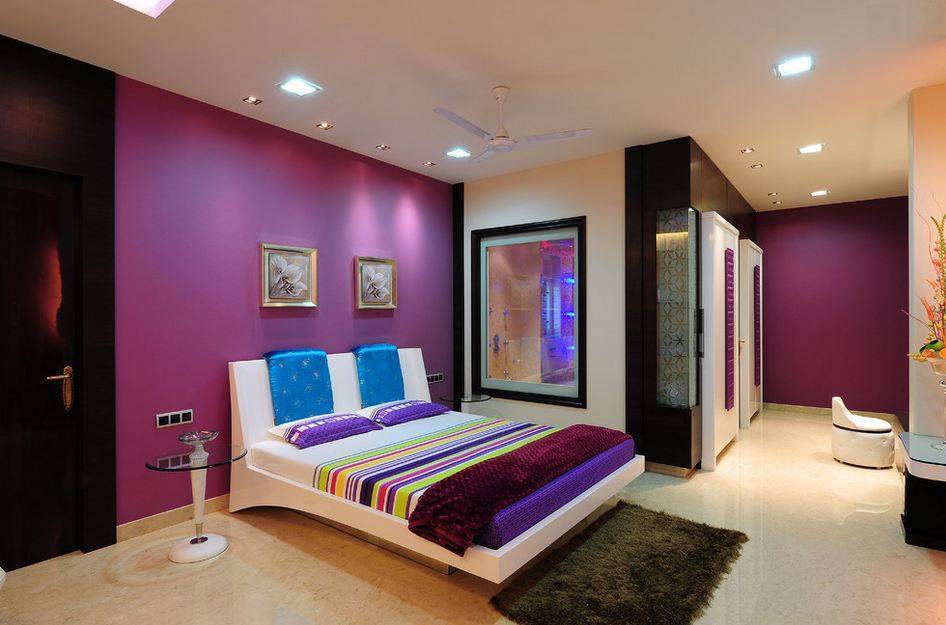 Динамику в интерьер добавляют акцентные стены в ярких тонах. Здесь могут сочетаться три-четыре цвета – например, темно-сиреневый, нежно-розовый и серый.