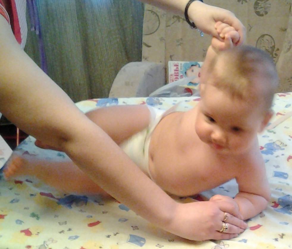 Потяните ребенка за руку в одну сторону из положения лежа на спине, осторожно уложите на бок, потом на живот. Повторите упражнение в другую сторону