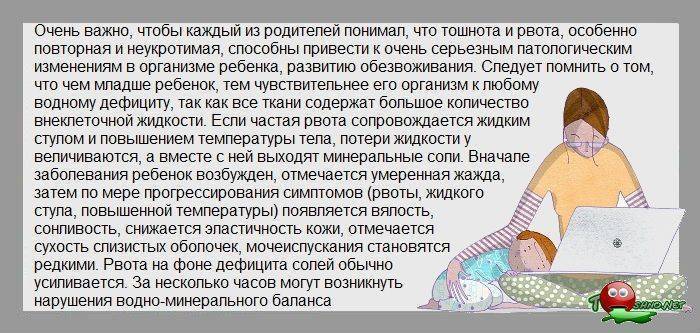 Противорвотные препараты хорошо снимают рвотный рефлекс. Но использовать их бездумно нельзя, так как есть много противопоказаний. До приезда врача ребенка хорошо отпаивают, чтобы не допустить обезвоживания. Только врач решает, насколько целесообразен прием противорвотных медикаментов в том или ином случае.