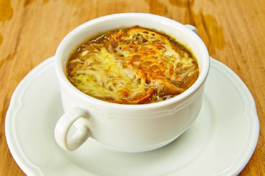 Еще один вариант — делают надрез на сырной корке с помощью ножа и вилки. В первую очередь съедают сыр, а затем уже наслаждаются вкусом лукового супа.
