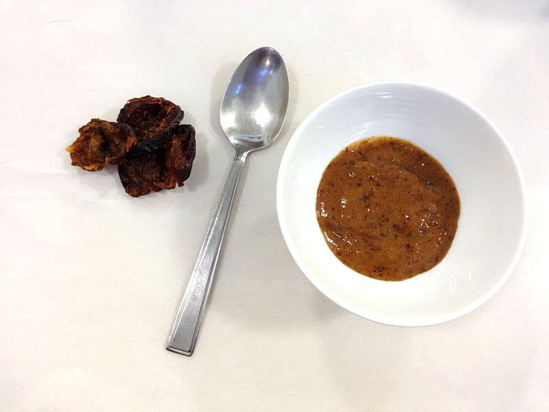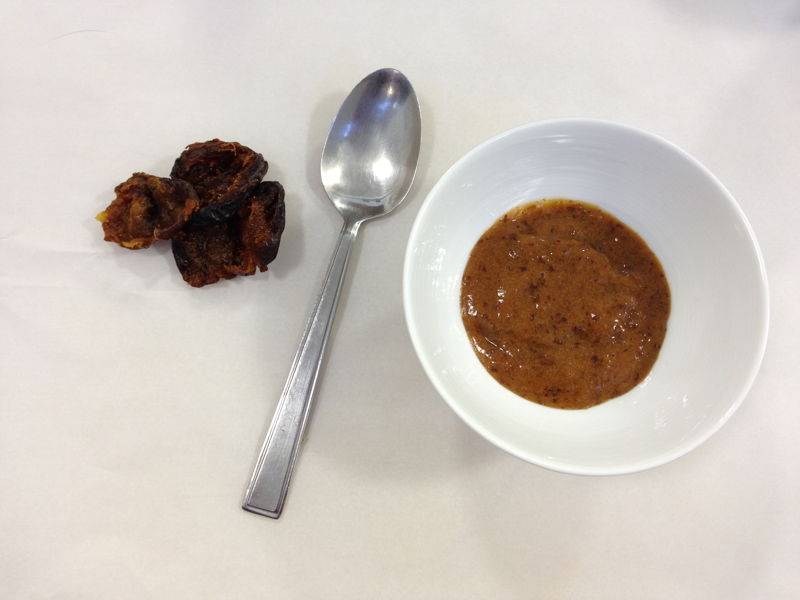 Восемь штучек чернослива заливают стаканом кипящей воды и, прикрыв плотно крышкой, оставляют настояться от 3 до 10 часов. За это время ягоды размякнут и набухнут. Черносливины вылавливают из отвара и протирают через сито. В итоге получается натуральное пюре.