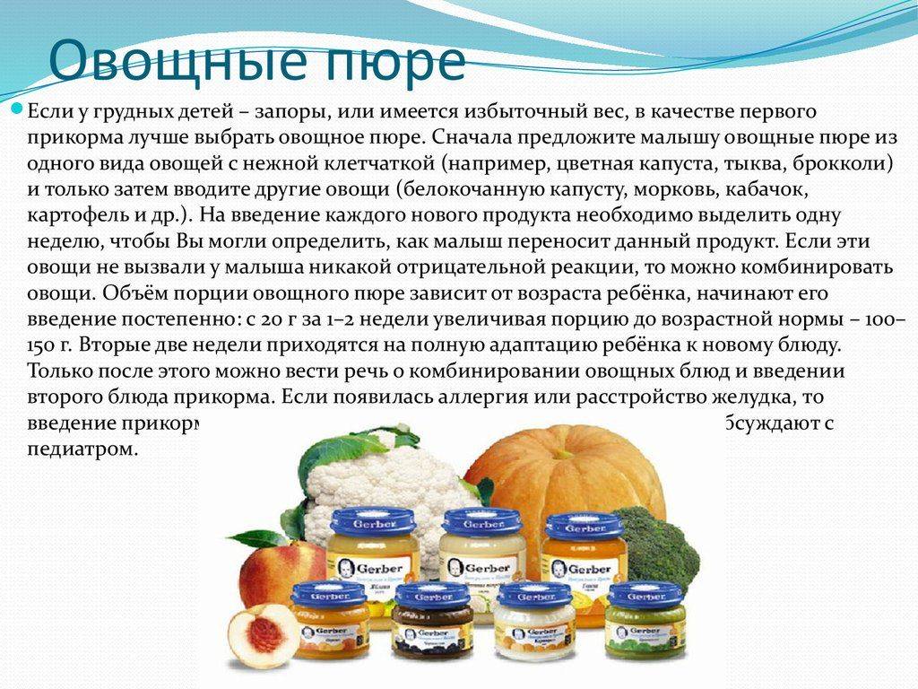 После полугода в рацион можно включить пюре. Стартовая дозировка – половина чайной ложки (во время утреннего кормления). Постепенно ее увеличивают до 20-30 г. Допускается добавлять растертую массу в кашу. Обычно после этого существующие проблемы с дефекацией полностью устраняются.