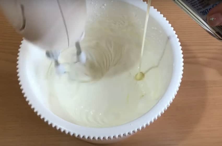 2. Вливайте к смеси сгущенку тонкой струйкой и продолжайте взбивать миксером.