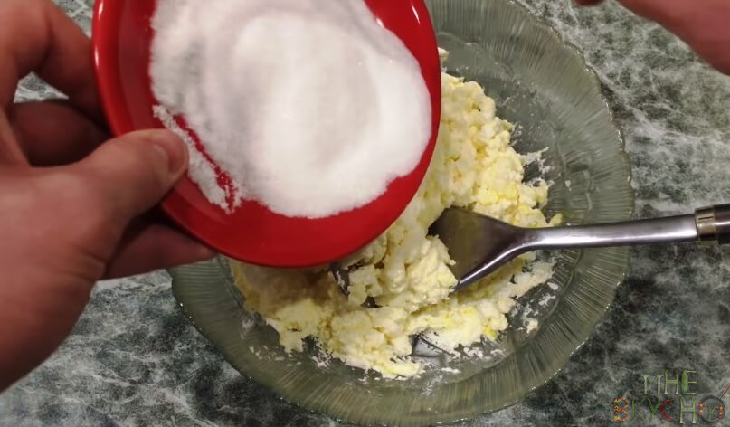 2. Добавляем пару ложек сахара. Его количество будет зависит от ваших вкусовых предпочтений или же если творог у вас кислый то сахара можно добавить побольше. Перемешивать лучше начать после следующего шага.