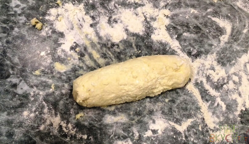 - От теста отщипывать руками небольшой кусочек, обвалять его в муке, скатать в шар и приплюснуть ладонью.