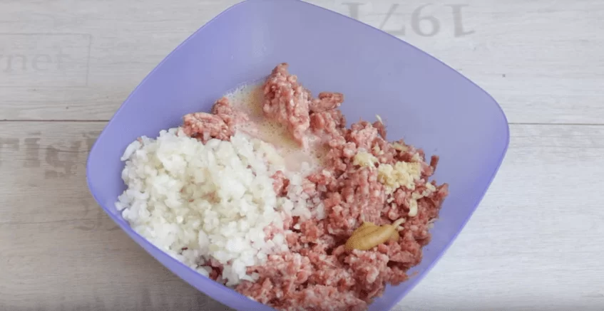 3. Если вы крутите мясо непосредственно сейчас, то и луковицу отправьте с ним. Если у вас продукт уже готовый, лук нужно либо мелко нарубить, либо воспользоваться для его измельчения блендером. К фаршу отправляем и остывший рис. Солим, перчим на вкус. Можно добавить любимых специй, а можно обойтись без них. Если любите, добавьте через пресс пару долек свежего чеснока или ложечку сушеного.