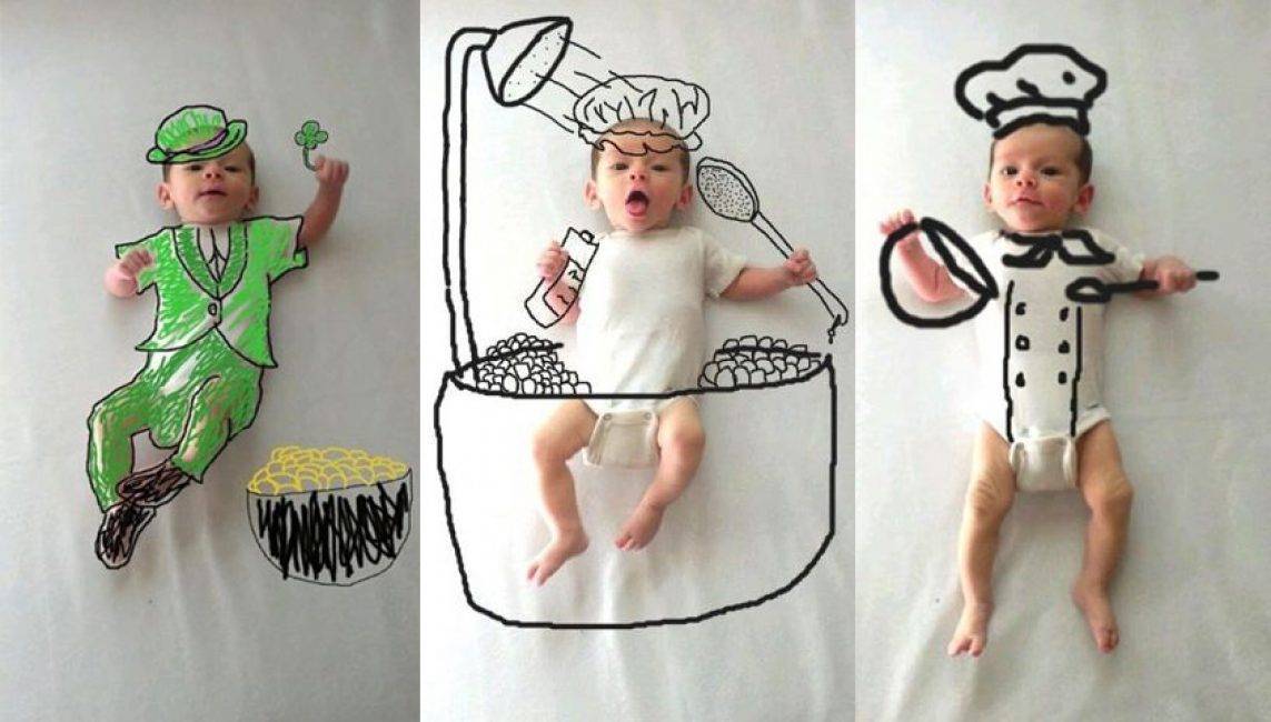 Креативные фото вы наверняка неоднократно встречали в Интернете. Одним из таких вариантов является создание рисованной истории, в которую размещают малыша. Вы можете нарисовать воздушный шар, на котором летит ваш малыш, корабль или плот, на котором он плывет. Гамак среди деревьев, в котором он спит, или что-либо другое, в зависимости от вашей фантазии. Достаточно просто разместить малыша на рисунок.