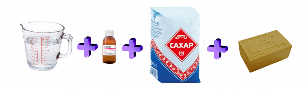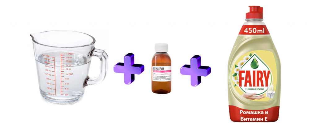 - С сахаром и глицерином. В 300 мл воды растворите 4 ч. л. сахара. Добавьте 100 мл Фейри. Поставьте раствор в холодильник на несколько часов. Затем добавьте 50 мл глицерина. Перемешайте жидкость.