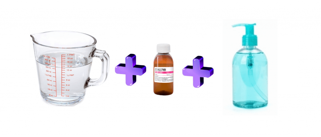 - С гелем-лубрикантом. Смешайте по 1 части глицерина и геля-лубриканта (технической смазки) с 2 частями Фейри. Подогрейте 4 части воды и влейте её в смесь. Всё тщательно перемешайте.