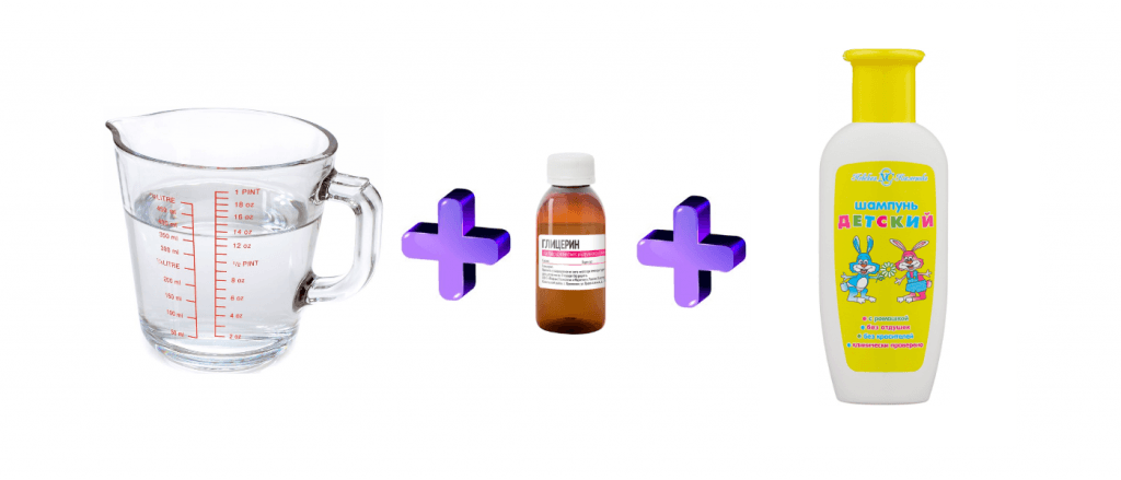 Если делать жидкость из шампуня, то только из детского. Он не содержит лишних добавок и не вызывает раздражения — не страшно, если раствор попадёт в глаза.