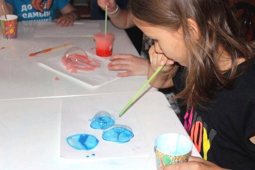 Раздайте каждому ребёнку по листу бумаги и соломинке. Заранее приготовьте разноцветные мыльные растворы с добавлением пищевых красителей. Объявите конкурс на лучший рисунок.