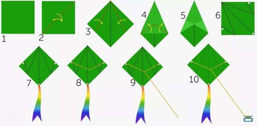 С помощью этого простого способа можно смастерить плоского бумажного змея, который будет хорошо и долго летать. Работа по изготовлению игрушки очень лёгкая, поэтому к ней можно привлекать детей. Постепенно они запомнят все действия и смогут самостоятельно делать подобные предметы. Правильная последовательность действий: