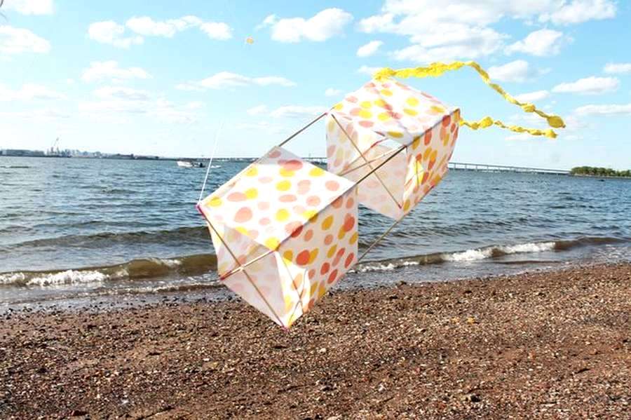 Воздушный змей коробочка летает очень хорошо, но из-за сложности конструкции и размеров делают такую модель не часто. Нужны бамбуковые палочки (4 по 60 см и 8 по 30) легкая непродуваемая ткань, лучше всего пластиковая скатерть.