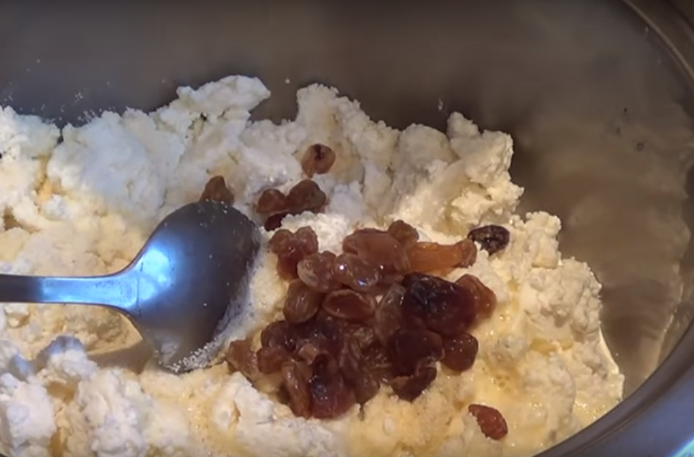 - С изюма сливаем жидкость, обсушиваем его на бумажных салфетках и добавляем в творожную массу. Хорошенько размешиваем.