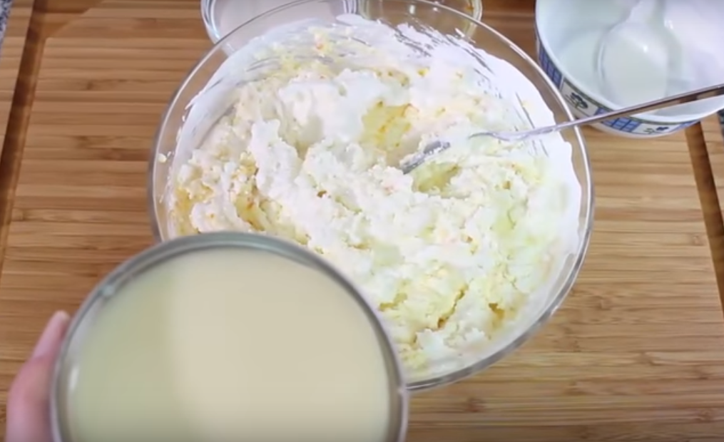 3. Вливаем сгущенку – пару ложек, по желанию – ее можно заменить сахаром.