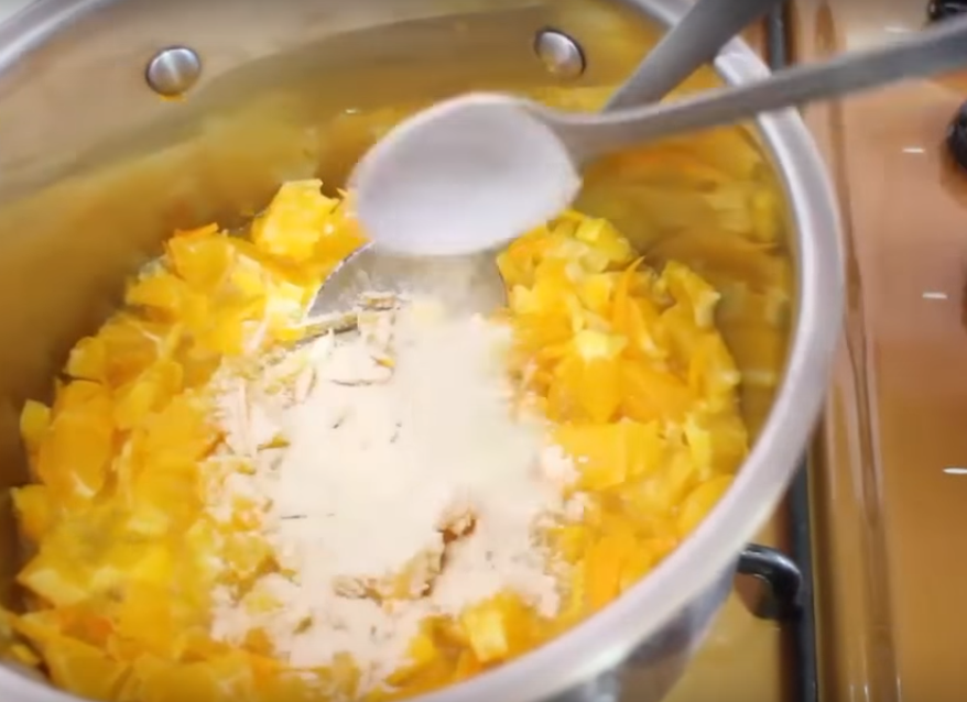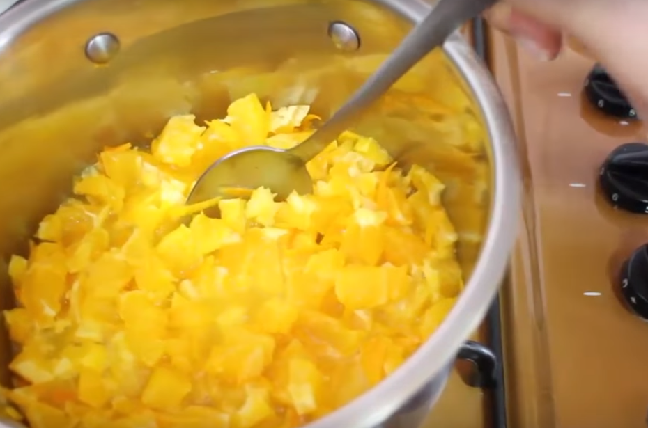 7. В апельсины, если они кисловатые, можно добавить немного сахара. Ставим их на огонь. Когда наши апельсины выделят сок, добавляем 1 ч. л агар-агара.