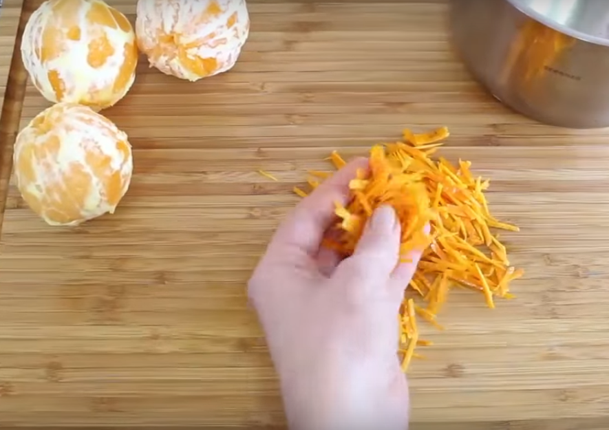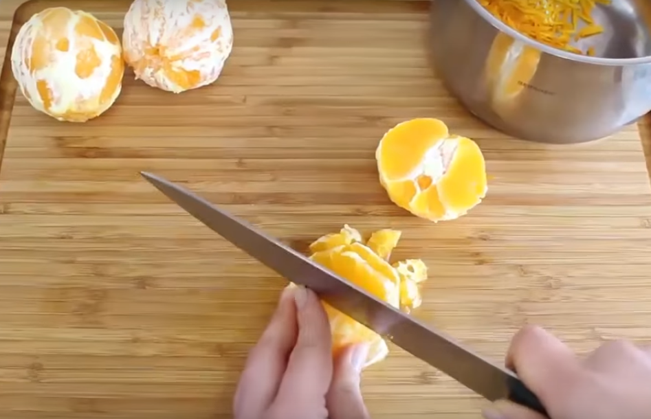6. Апельсины и апельсиновые корочки (по желанию) нарезаем. Складываем в кастрюлю.