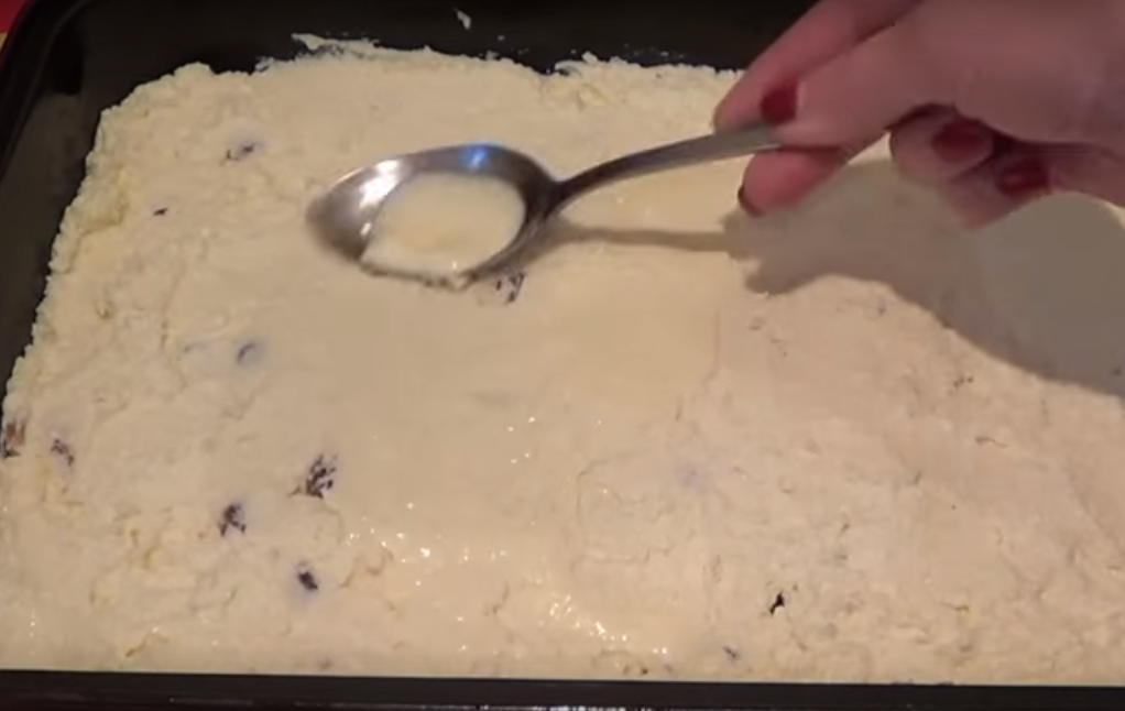 И дальше соблюдаем весь процесс по книге — выкладываем творожную массу, сравниваем поверхность, сверху смазываем сметаной, сбрызгиваем маслом.