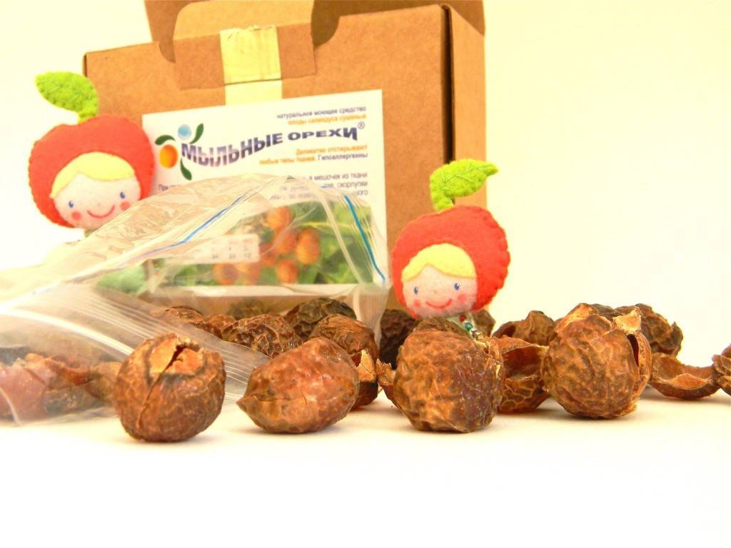 Плоды мыльного дерева — это экологически безопасное и натуральное средство. В них содержится натуральные ПАВ, которые не приносят вреда здоровью ребенка. Удобно применение орехов при машинной стирке. Плоды помещают в тканевый мешочек, а после отправляют в барабан. Недостатком средства можно назвать низкую эффективность.