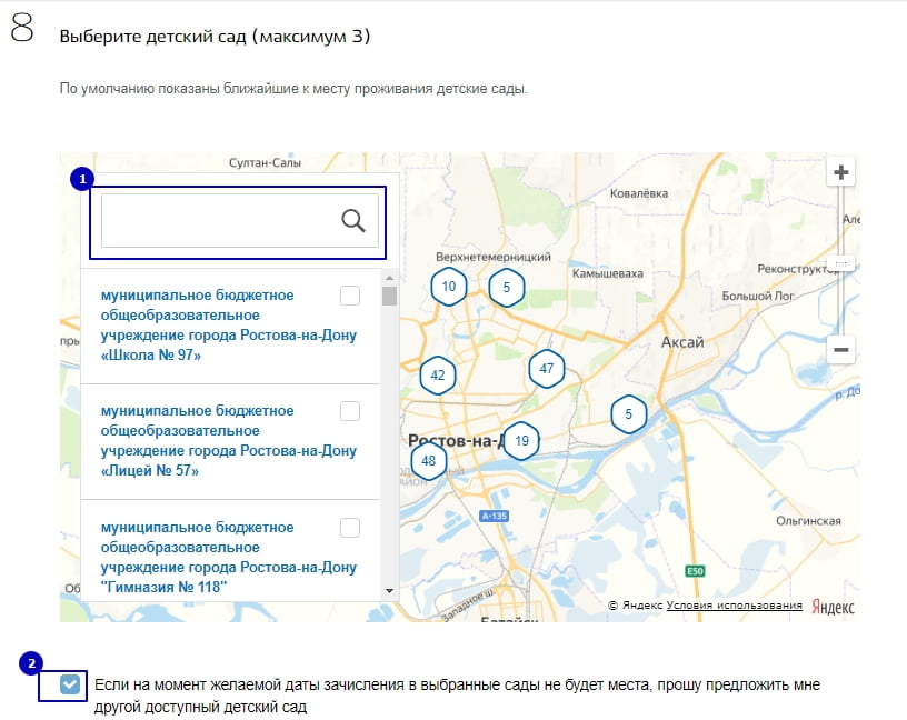 Укажите предпочитаемое дошкольное учреждение. В вопросе выбора детского сада поможет специальная интерактивная карта. Встать в очередь можно в несколько ДОУ одновременно.