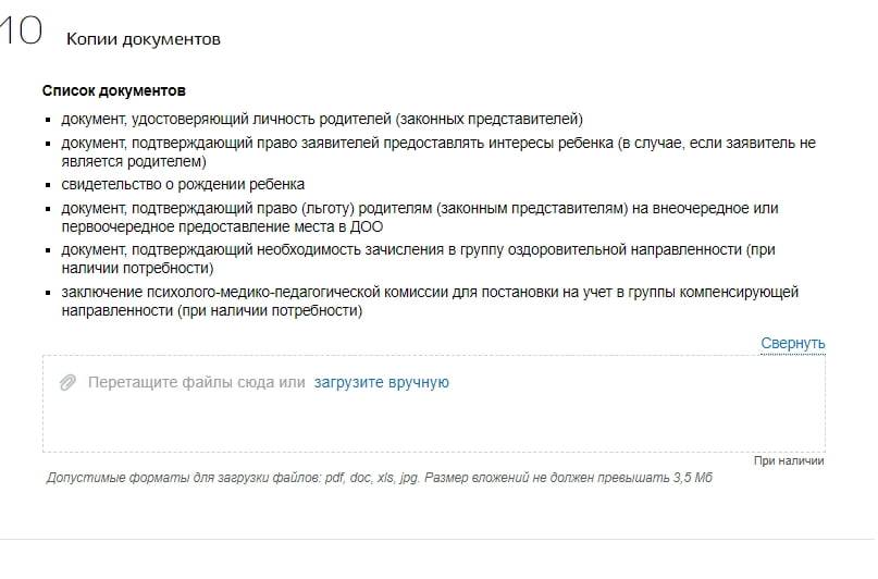 Чтобы постановка ребёнка на учёт прошла без проблем, нужно к электронному заявлению прикрепить отсканированные бумаги (формат JPEG).