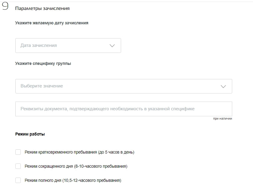 В 9 графе следует указать желаемую дату зачисления, а также специфику группы (краткосрочное или временное пребывание, режим неполного дня и так далее). А затем отметить льготы, если таковые имеются.