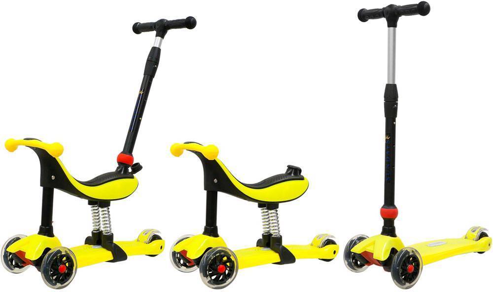 Яркая рама и светящиеся колеса привлекают внимание и позволяют кататься даже в темное время суток, последние сделаны из ПВХ, поэтому мягко едут по ровной поверхности и не стучат на кочках. При необходимости, конструкция складывается одним движением