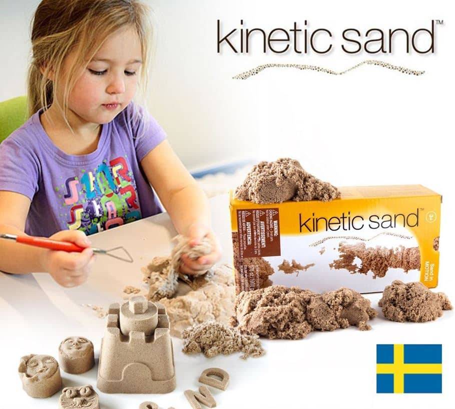 Кинетический песок – инновационная разработка шведских ученых, предназначенная для детских занятий. Почти 100% его объема составляет обычный кварцевый песок. Но его физические свойства кардинально меняются благодаря минимальному количеству синтетической добавки Е900. Благодаря ей кинетик не пересыхает и не прилипает к рукам.