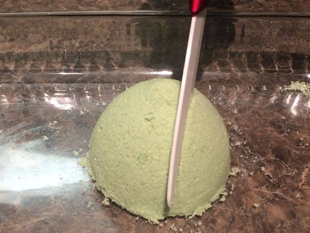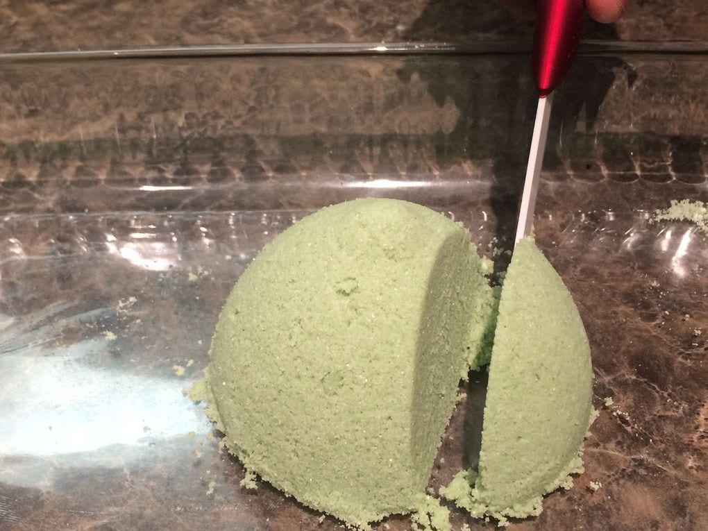 Проверить песок можно несколькими способами. Я проверила свой песок на возможность держать форму и прилипать к самому себе. Для этого я плотно набила песок в обычную чашку (можно использовать любую форму) и перевернула её! Все играли в песочнице в детстве? Затем я отрезала кусочек песка ножом. Как видите оба кусочка не рассыпались и остались стоять на своем месте!